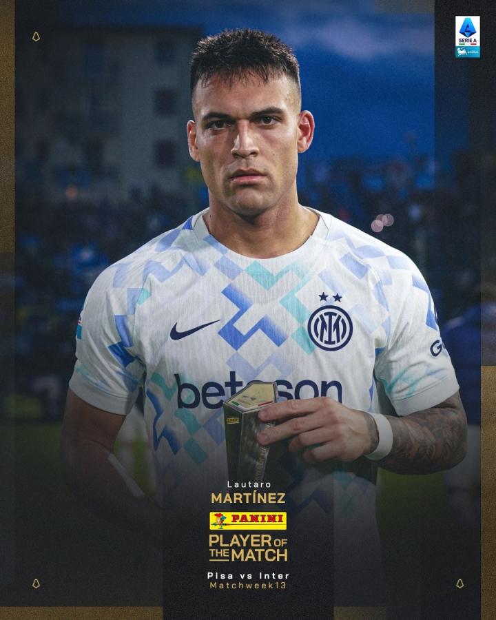 北京时间12月1日,意甲联赛第13轮赛事中,劳塔罗凭借独中两元的出色发挥,助力国际米兰在客场以2-0完胜升班马比萨队,成功终结球队此前遭遇的两连败颓势。赛后,凭借本场优异表现,劳塔罗获意甲官方授予本场最佳球员称号。